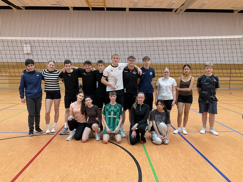 Beim Volleyballturnier vor den Weihnachtsferien haben unsere 9. und 10. Klassen auch dieses Mal wieder alles gegeben und in mehreren Partien den Sieger ausgespielt. Im spannenden Quattro-Volleyballturnier der 9. Klassen konnte der „Pablo FC“ sich am Ende durchsetzen und als Sieger vom Platz gehen. Den Turniersieg mussten sich nach einem hitzigen Wettkampf „Die haarigen Babos“ und das „Schmetterlingskommando“ teilen. Das Lehrerteam wurde schließlich auch noch herausgefordert und insgesamt hatten alle viel Spaß und hoffen auf eine Wiederholung.