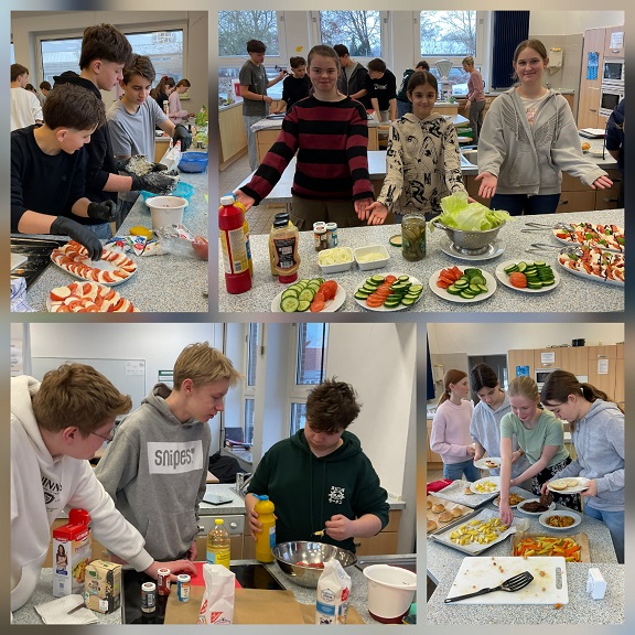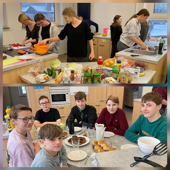 Am Montag, den 26.01.2026, und am Donnerstag, den 29.01.2026, hatten die Klassen 8a und 8b einen Kochtag. Ich habe von mehreren Mitschülern gehört, dass sich jeder auf diesen Tag gefreut hat. Wir haben uns an diesem Tag in der normalen Schulzeit vor der Küche in der Eschhofschule getroffen und sind hineingegangen. Dort haben wir den Tag besprochen und uns wurden die Regeln erklärt. Dann haben wir eine Einkaufsliste bekommen und sind zu Edeka gelaufen. Wir haben dort alles besorgt, z.B. Fleisch, Salat, Kartoffeln und alle anderen Zutaten und dann hat Frau Schneider den Einkauf bezahlt. Anschließend sind wir zurück in die Küche gegangen und jede Gruppe hat einen eigenen Kochplatz bekommen. Wir haben Burger (mit Fleisch oder vegetarisch), Pommes, Süßkartoffelpommes, Tomate-Mozzarella, Salatbeilagen, Limonade und Früchtequark hergestellt. Es hat sehr viel Spaß gemacht zu kochen und jeder hat mitgeholfen. Ich habe nicht mitbekommen, dass es jemanden gab, der unzufrieden mit dem Tag war. Nach dem Essen mussten wir natürlich auch den eigenen Kochplatz aufräumen und das Geschirr abwaschen. Nachdem alle an einem Tisch gegessen hatten, wurde aufgeräumt und jeder hat jeden unterstützt. Wir würden uns freuen, wenn dieser Tag wiederholt werden könnte und auch die Lehrkräfte waren sehr zufrieden.