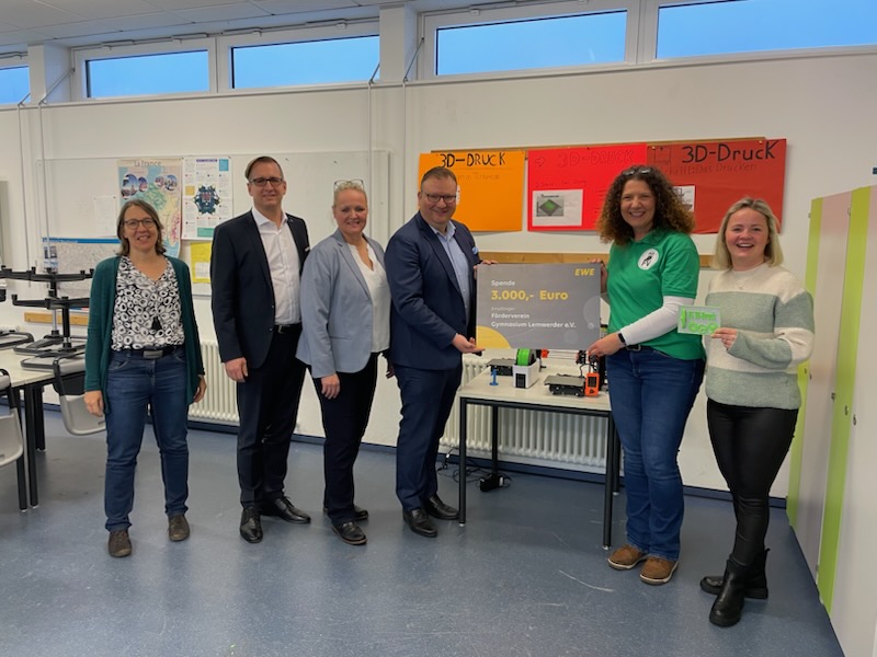 Einen symbolischen Scheck in Höhe von 3000 Euro hat EWE NETZ-Kommunalbetreuer Ralf von Dzwonkowski Bettina Sauter, Vorsitzende des Fördervereins des Gymnasiums Lemwerder, ausgehändigt. Die EWE hatte im Vorfeld dazu aufgerufen, Ideen zur Förderung von Kindern und Jugendlichen einzureichen.